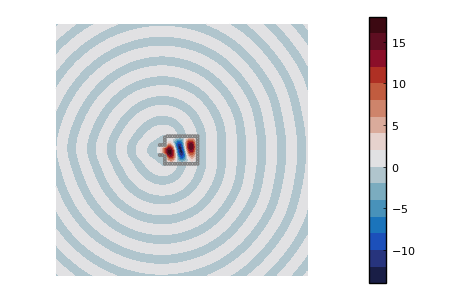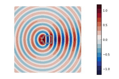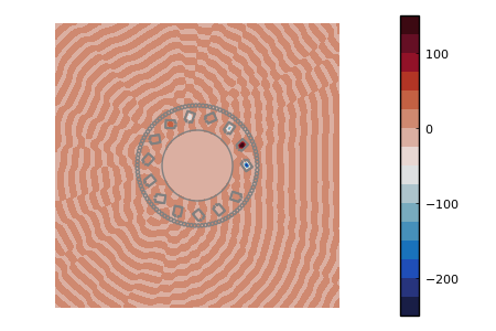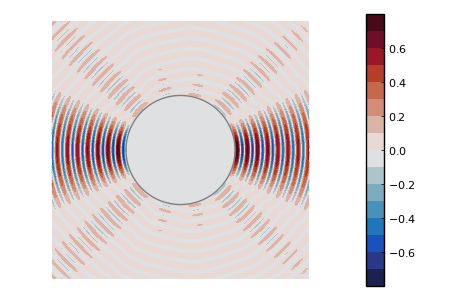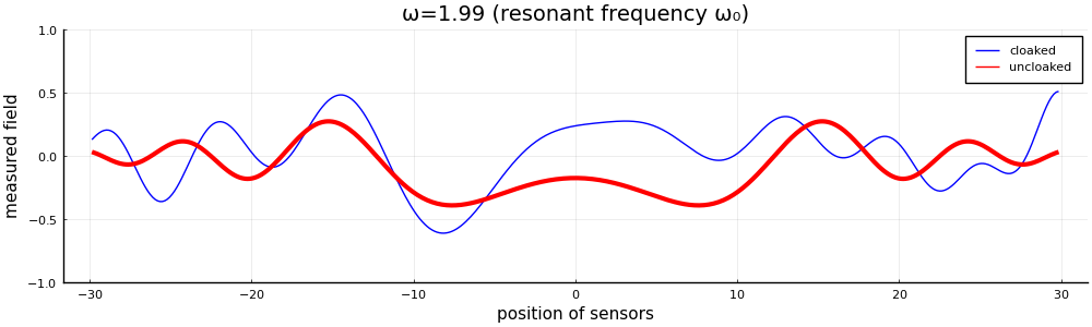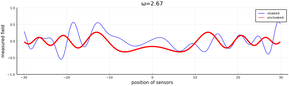 To measure the efficiency of the cloaking, we will qualitatively compare the simulated data from a cloaked and an uncloaked target. To visualise the effect of the cloak, we computed the scattered field near the boundary of the cloaked and uncloaked target (cf Figure 4). We see that the presence of the resonators significantly distorts the fields. Indeed, while most of the energy released by the uncloaked target is confined in cones, it is spread in all directions in the case of the cloaked target. We outline the impact of the coat in more details in Figure 5, where the measurements at the sensors are plotted for both the cloaked and uncloaked target. An important observation is that while the profile of the uncloaked target is almost the same for the two different frequencies, especially around the sensors in the middle, the profile of the cloaked target significantly changes.